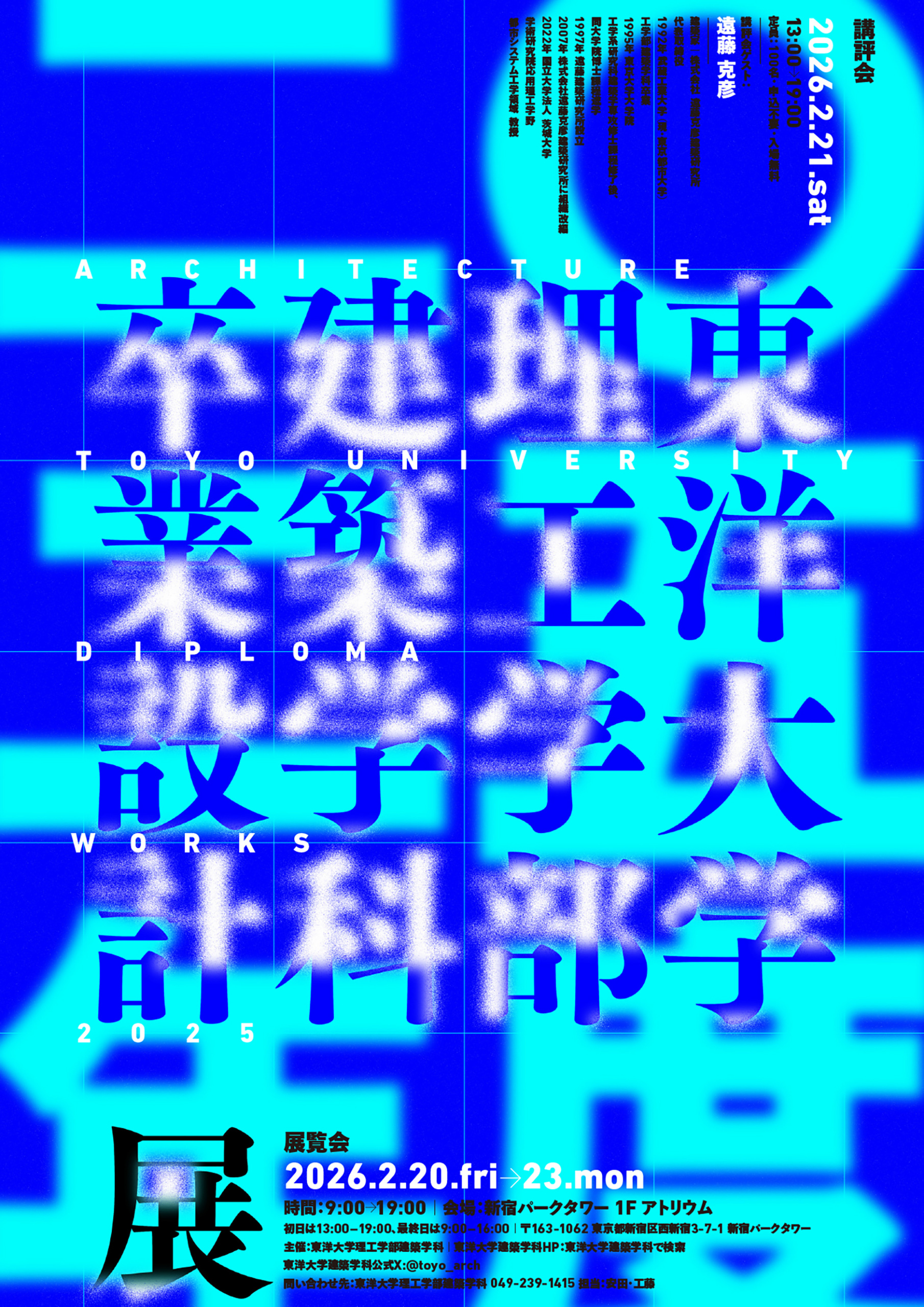 news index back next 東洋大学理工学部建築学科2025年度卒業設計展 2026.01.20 東洋大学理工学部建築学科2025年度卒業設計展が開催されます。 本展のポスターをデザインしました。 展覧会は2月20日(金)〜23日(月)の期間での開催です。 ぜひご覧ください。 archive 2019 2018 2017 2016 2015 2014 2013 2012